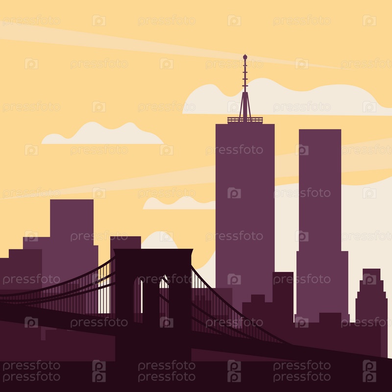 Пейзаж нью-йоркского Бруклинского моста на фоне восхода солнца и облачного неба. Цветовая векторная иллюстрация плоского стиля. EPS10