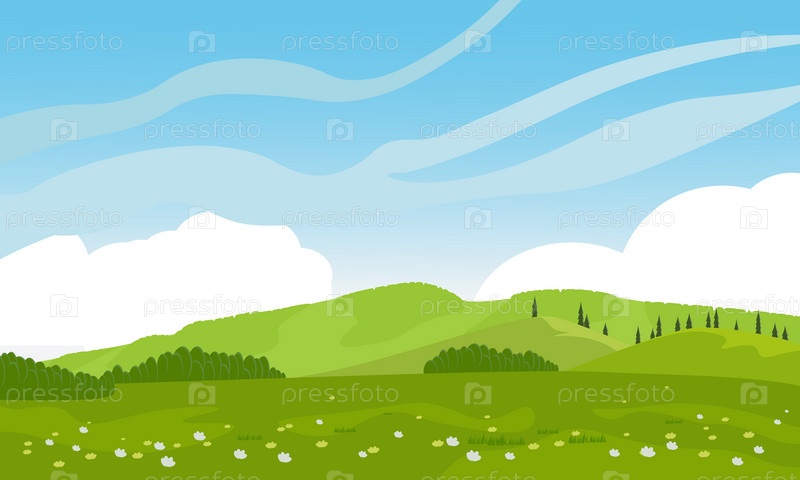 Красивый сельский пейзаж с полем, холмами, лесом и небом с облаками. Цветная векторная иллюстрация плоского стиля для баннера