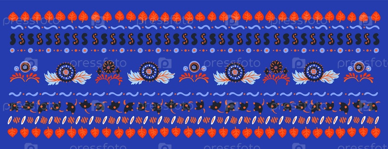Набор этнических элементов. Бордюр представляет собой полосу с цветами, листьями, ветками, вензелями. Народная вышивка. Славянский, украинский, русский мотив. Хохлома, матрешка, дымковская игрушка. Мексиканский, индийский, цыганский ковер. Вязаное кружево