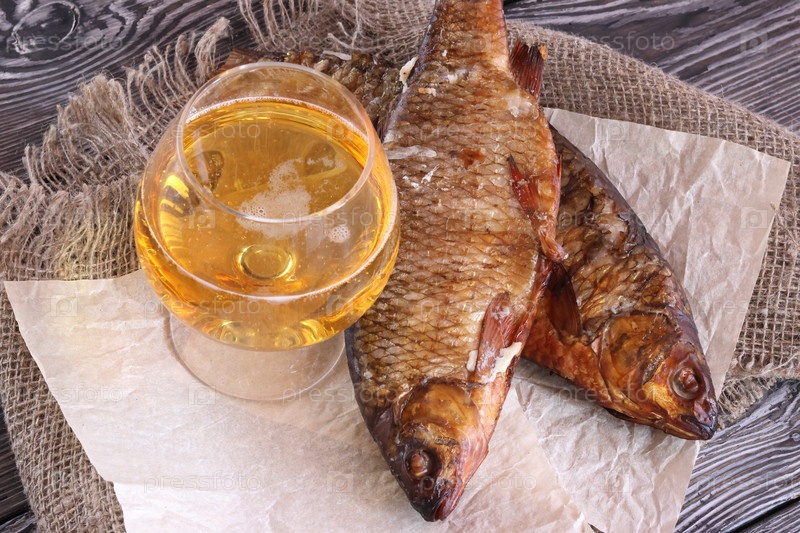 Копченая плотва и стакан пива. На бумаге. Крупный план