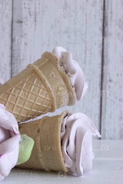 Зефир в вафельных рожках. На досках, окрашенных в белый цвет