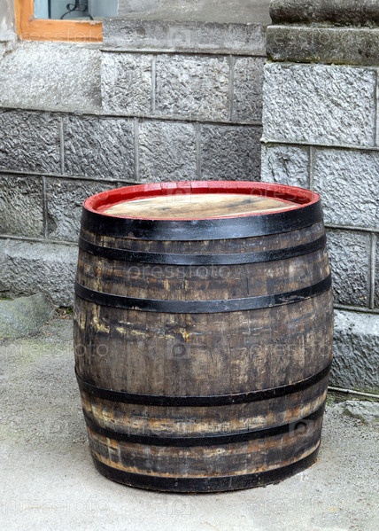 Большая деревянная винная бочка стоит у каменной стены. Производство и хранение вина