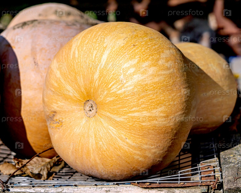 Большая тыква лежит снаружи в солнечный день. Заготовка овощей на зиму. Тыква лежит на деревянной поверхности. Рядом с ней еще одна тыква