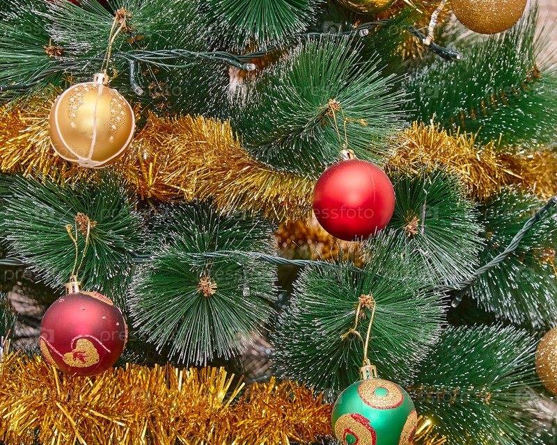 На искусственной елке висят разноцветные стеклянные шары и гирлянды. Искусственная ель