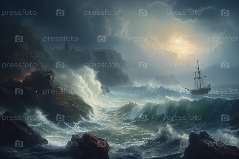 Кораблекрушение древнего деревянного мачтового корабля во время шторма, в стиле масляной живописи, Сгенерировано Ай