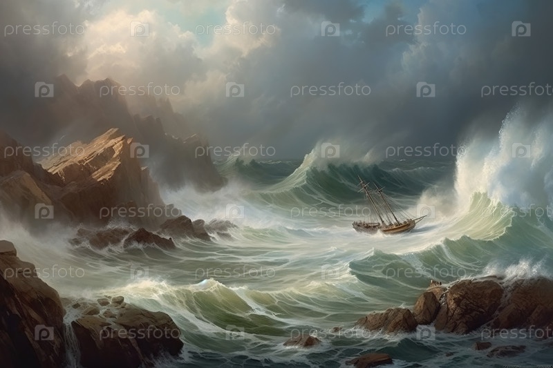 Кораблекрушение древнего деревянного мачтового корабля во время шторма, в стиле масляной живописи, Сгенерировано Ай