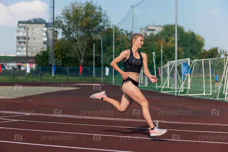 Молодая девушка бежит по беговой дорожке на стадионе на открытом воздухе