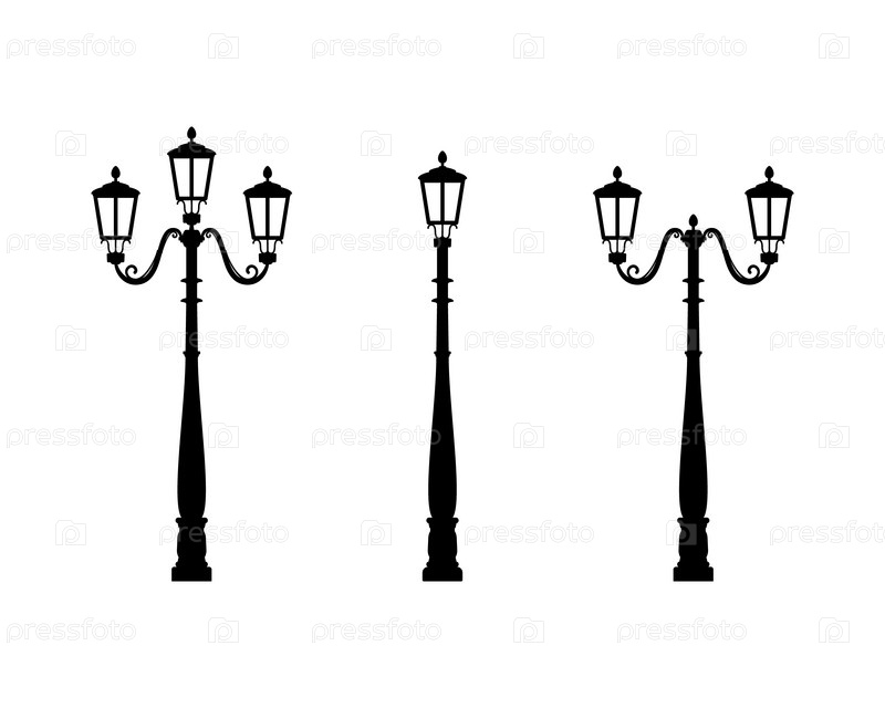 Набор силуэтов уличных фонарей. Черно-белая иллюстрация, белый изолированный фон