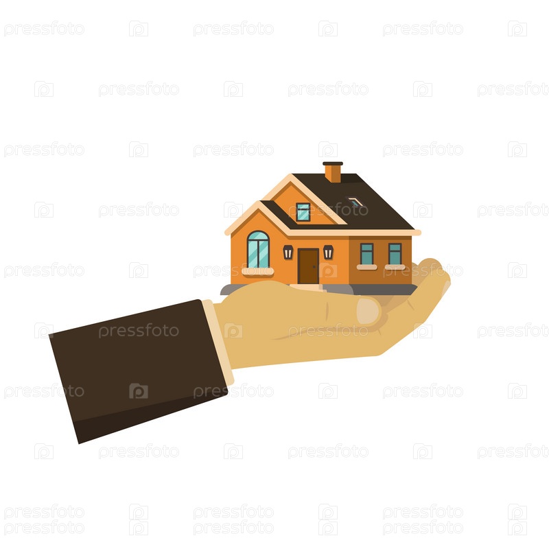 Открытая рука держит дом. Концепция продажи, сдачи в аренду недвижимости, ипотеки, кредиты, страхование. Цветная векторная иллюстрация плоского стиля
