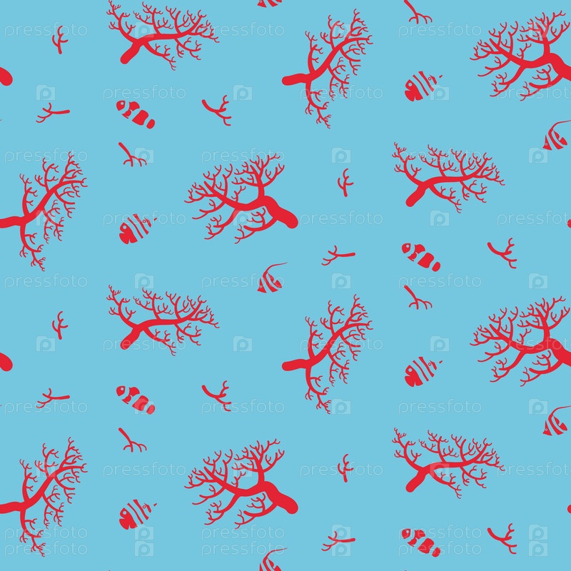 Морской подводный узор с кораллами и рыбой. Сине-красные цвета. Векторная иллюстрация