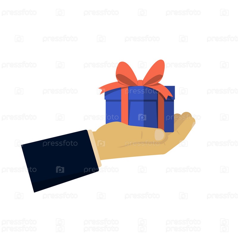 Рука дарит подарочную коробку с лентой и бантом. Цветная векторная иллюстрация плоского стиля