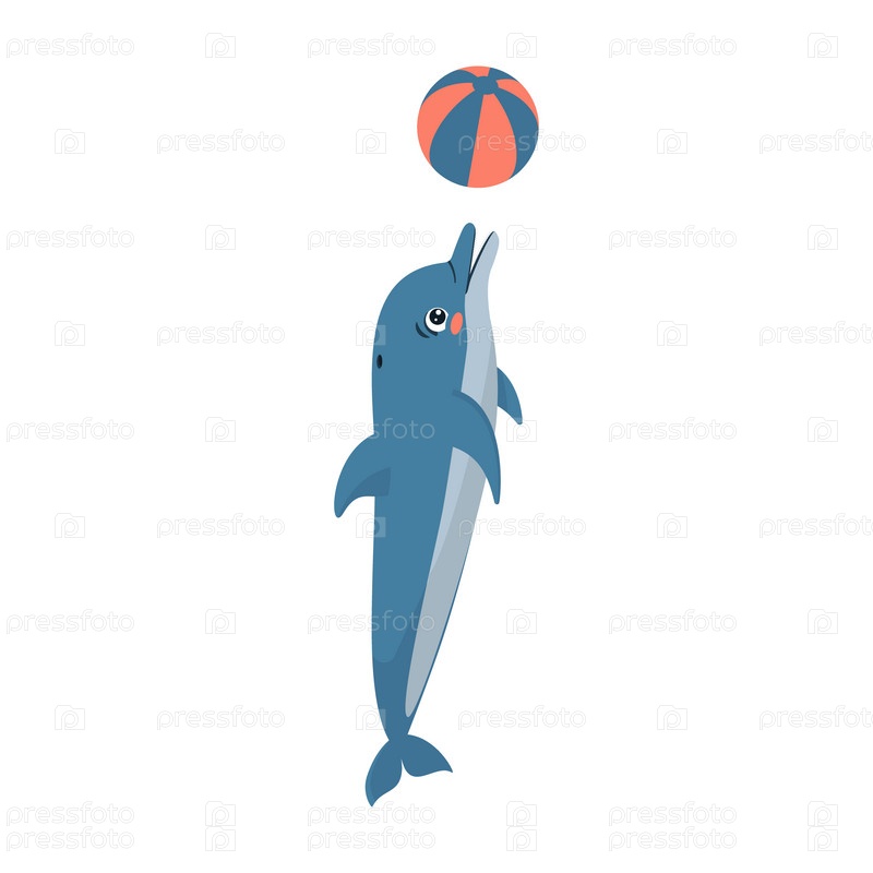 Милый мультяшный дельфин прыгает с мячом. Цветная векторная иллюстрация