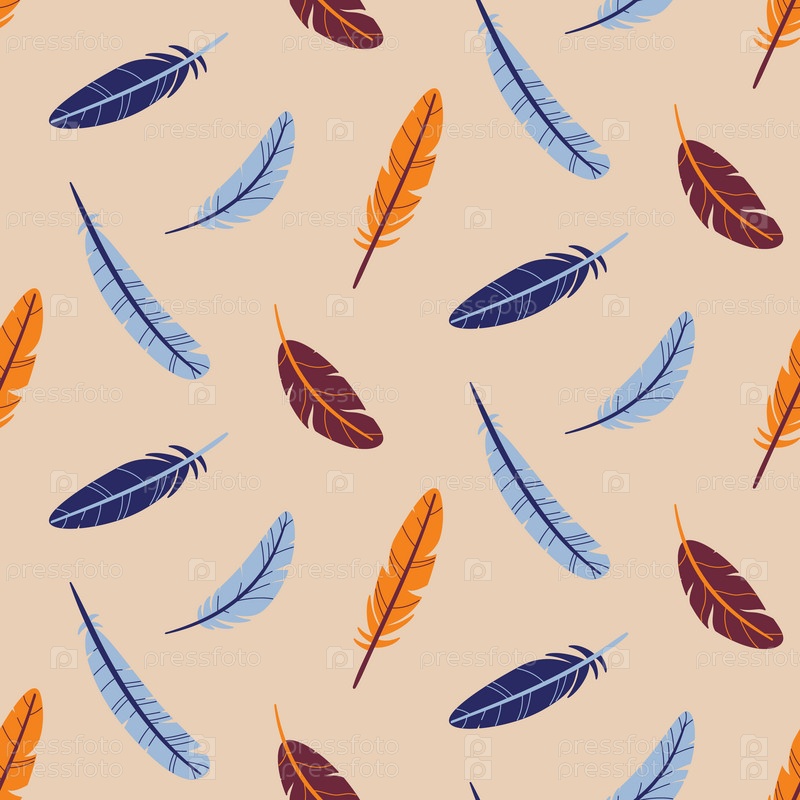 Бесшовный рисунок летящих и падающих перьев. Цветная векторная иллюстрация