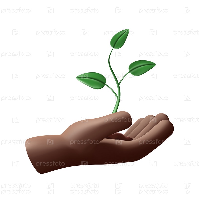3D черная рука, держащая ветвь. Концепция развития, роста, сохранения окружающей среды. Цветовая векторная иллюстрация, реалистичный стиль