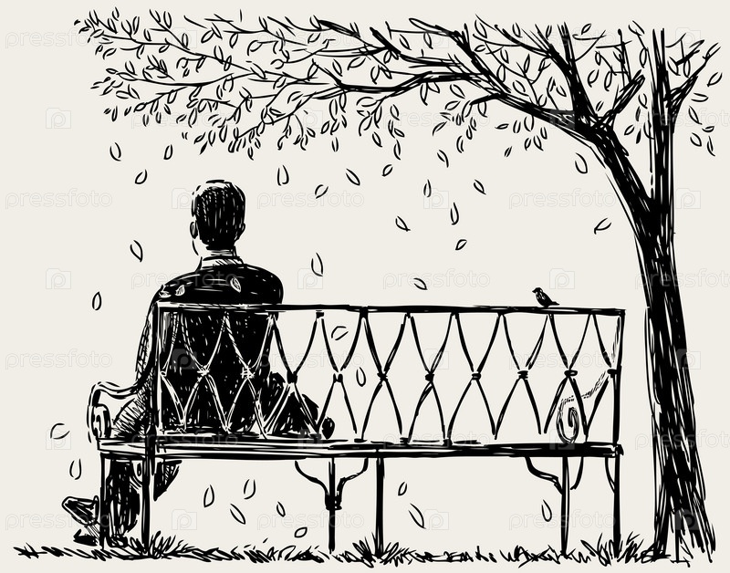 Одинокий мужчина сидит на скамейке в парке