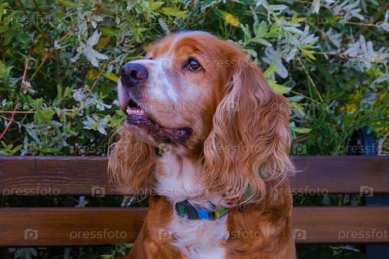 Красивая, умная старая собака породы русский спаниель в полупрофиль