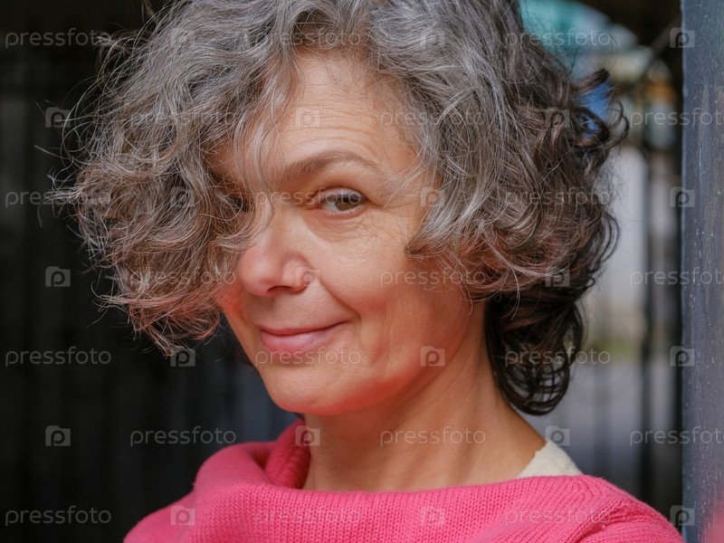 Женщина среднего возраста с седыми вьющимися волосами в розовом джемпере