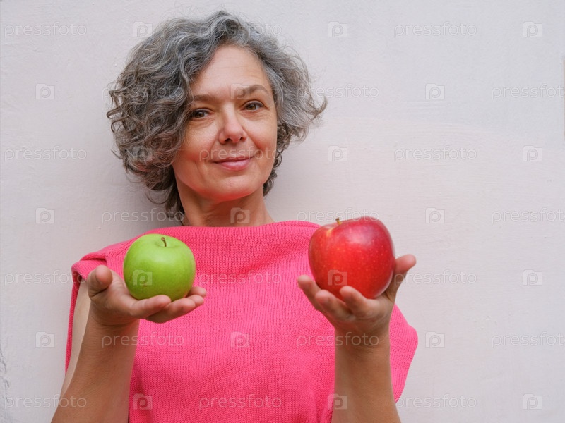 Женщина в розовом джемпере с седыми волосами держит в руках зеленое и красное яблоко