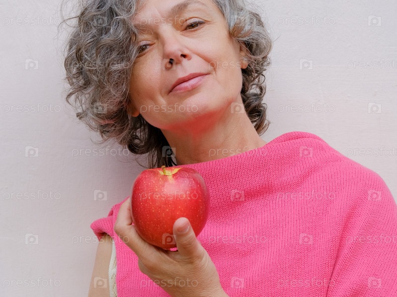 Женщина с седыми вьющимися волосами держит в руке красное яблоко
