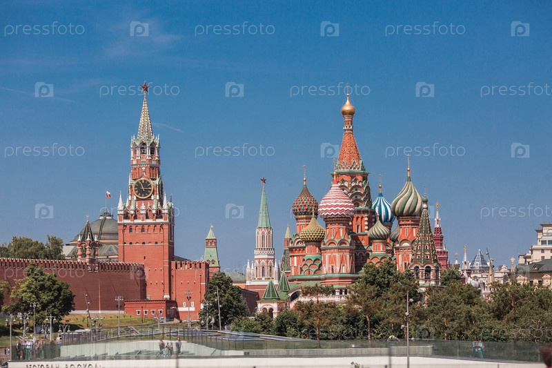 МОСКВА, РОССИЯ - 9 ИЮНЯ 2023 г.: Собор Василия Блаженного на Васильевском спуске на Красной площади в солнечный день на фоне ярко-голубого неба. Вид на собор из парка «Зарядье». Популярная туристическая достопримечательность Москвы