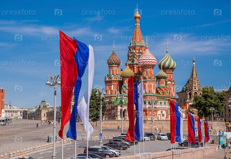 Вид на Кремлевские башни, Храм Христа Спасителя и Большой Москворецкий мост, украшенный российским триколором к празднику Дня России 12 июня. Россия, Москва