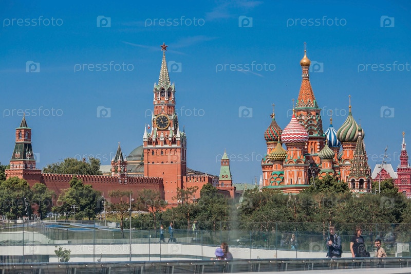 МОСКВА, РОССИЯ - 9 ИЮНЯ 2023 г.: Собор Василия Блаженного на Васильевском спуске на Красной площади в солнечный день на фоне ярко-голубого неба. Вид на собор из парка «Зарядье». Популярная туристическая достопримечательность Москвы
