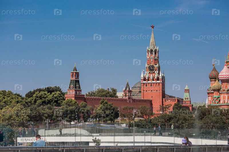 МОСКВА, РОССИЯ - 9 ИЮНЯ 2023 г.: Собор Василия Блаженного на Васильевском спуске на Красной площади в солнечный день на фоне ярко-голубого неба. Вид на собор из парка «Зарядье». Популярная туристическая достопримечательность Москвы
