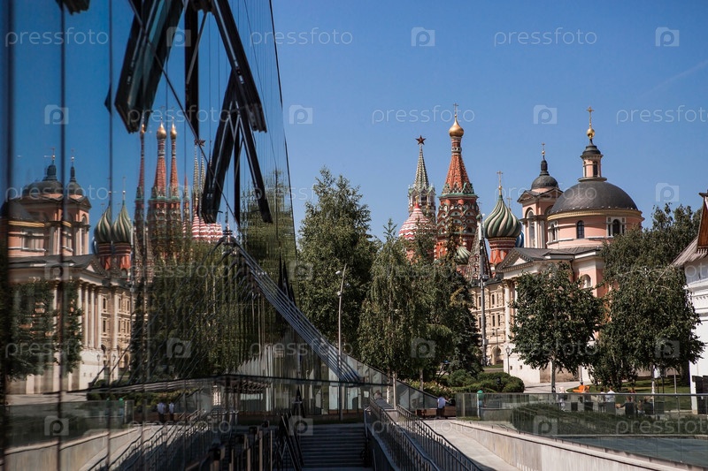 Москва, Россия: Церковь великомученицы Варвары и собор Василия Блаженного на улице Варварка возле Красной площади в солнечный летний день. Вид на храм из парка «Зарядье»