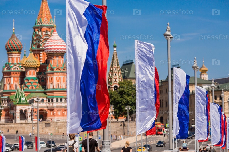Вид на Кремлевские башни, Храм Христа Спасителя и Большой Москворецкий мост, украшенный российским триколором к празднику Дня России 12 июня. Россия, Москва