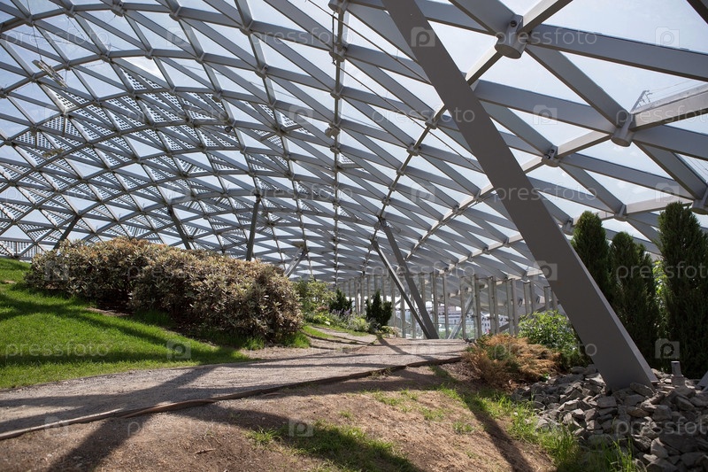 МОСКВА, РОССИЯ - 9 июня 2023 года: под стеклянным куполом амфитеатра в парке "Зарядье" в Москве. Самая большая в мире полупрозрачная конструкция, которая согреет вас зимой