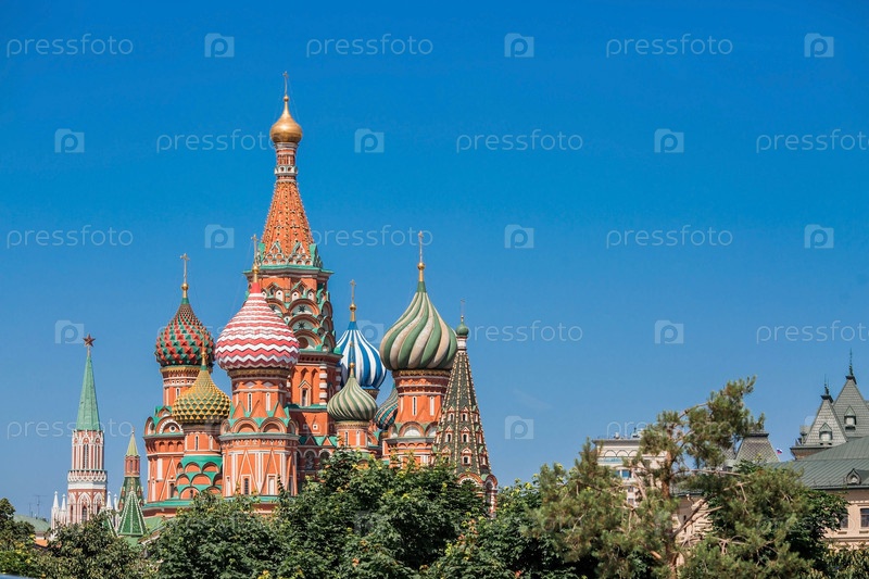 МОСКВА, РОССИЯ - 9 ИЮНЯ 2023 г.: Собор Василия Блаженного на Васильевском спуске на Красной площади в солнечный день на фоне ярко-голубого неба. Популярная туристическая достопримечательность Москвы
