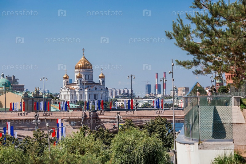 Вид на Кремлевские башни, Храм Христа Спасителя и Большой Москворецкий мост, украшенный российским триколором к празднику Дня России 12 июня. Россия, Москва