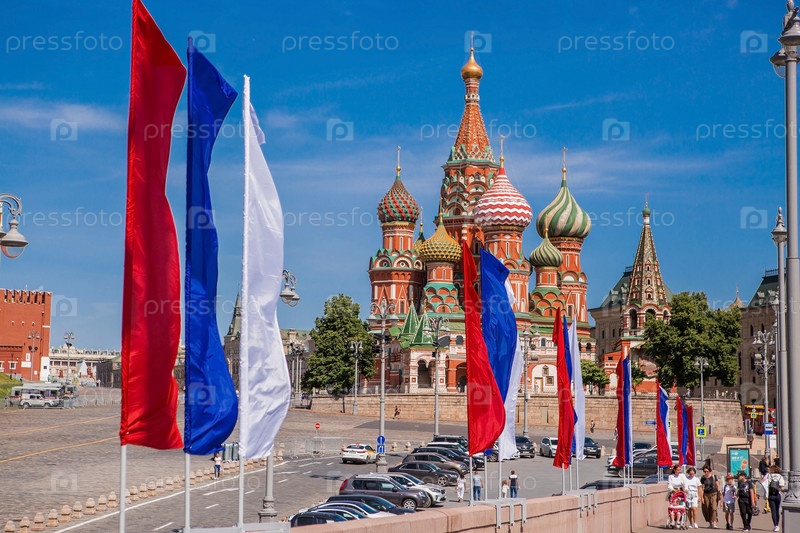 Россия. Москва. Государственный флаг Российской Федерации на фоне собора Василия Блаженного на Васильевском спуске. Русский триколор. Праздник День России 12 июня