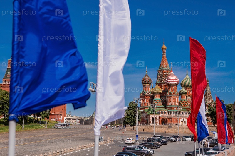 Россия. Москва. Государственный флаг Российской Федерации на фоне собора Василия Блаженного на Васильевском спуске. Русский триколор. Праздник День России 12 июня