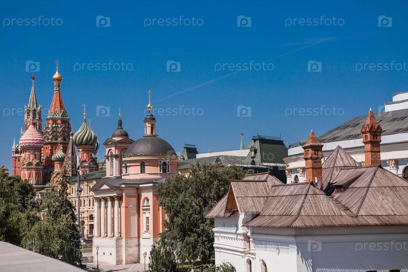 Москва, Россия: Церковь великомученицы Варвары и собор Василия Блаженного на улице Варварка возле Красной площади в солнечный летний день. Вид на храм из парка «Зарядье»