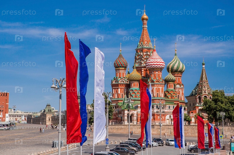 Россия. Москва. Государственный флаг Российской Федерации на фоне собора Василия Блаженного на Васильевском спуске. Русский триколор. Праздник День России 12 июня