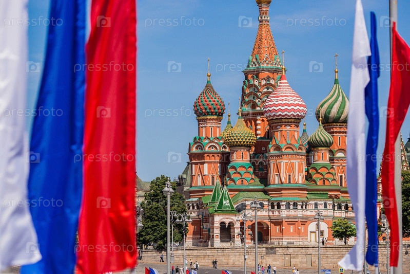 Россия. Москва. Государственный флаг Российской Федерации на фоне собора Василия Блаженного на Васильевском спуске. Русский триколор. Праздник День России 12 июня
