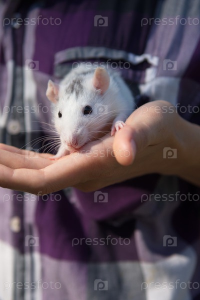 Домашняя крыса в руках молодой женщины на открытом воздухе. концепция защиты животных
