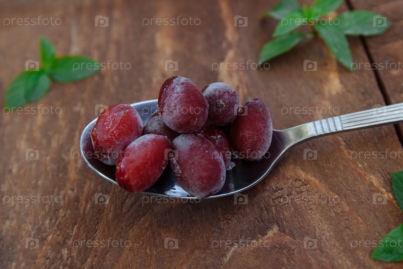 Замороженные красные ягоды кизила лежат на столовой ложке на коричневом деревянном фоне с зелеными листьями мяты