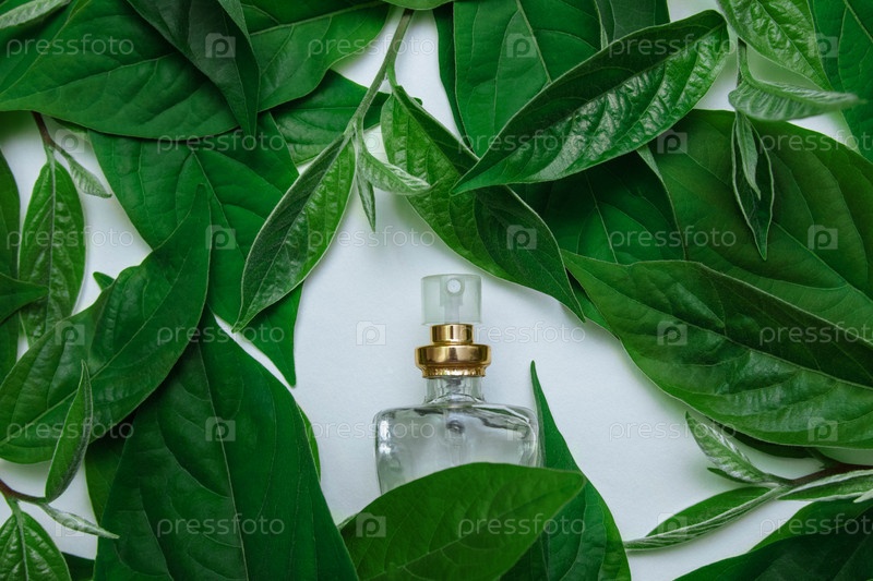 Стеклянный прозрачный флакон духов на белом фоне с зелеными листьями крупным планом, женские аксессуары и концепция косметики, уход за телом, мода, элегантность и гламур, рекламный шаблон