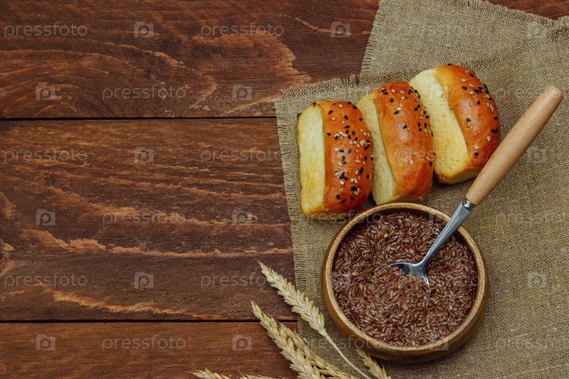 Булочки на льняной салфетке с семенами льна в миске с ложкой и кучей сушеной пшеницы на коричневом деревянном фоне вид сверху, концепция пекарни и здоровое питание и диета