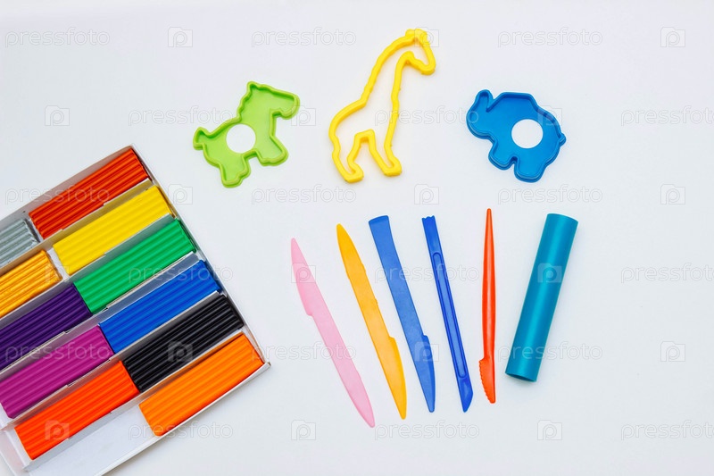 Разноцветный пластилин в коробке с инструментами и формами животных для моделирования на белом фоне вид сверху