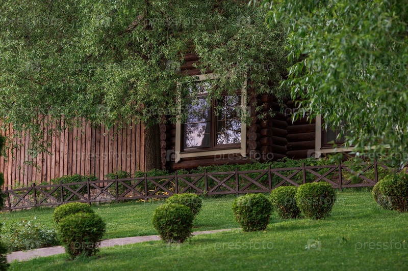 Красивый ландшафтный дизайн в парке. Подстриженные деревья, ровный газон. Сюжетный дизайн. Концепция отдыха на природе