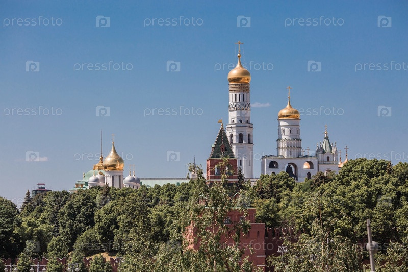 Москва, Россия, июнь 2023 г.: Вид на колокол Ивана Великого в Московском Кремле за Кремлевской стеной в солнечный летний день