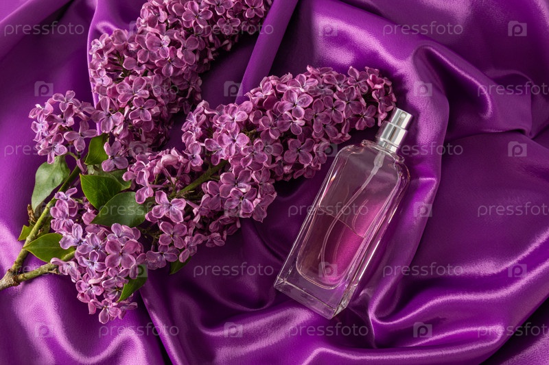 Косметический парфюмерный спрей в стеклянной бутылке на атласно-фиолетовом фоне с веткой нежной сирени. Презентация продукта