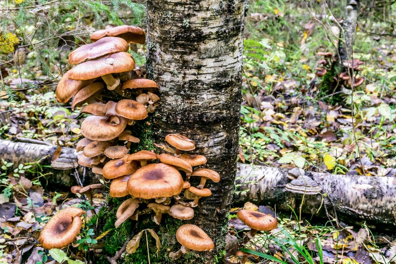 Осенние грибы растут на стволе березы. Осенние опята. Осенний лес. Сбор грибов