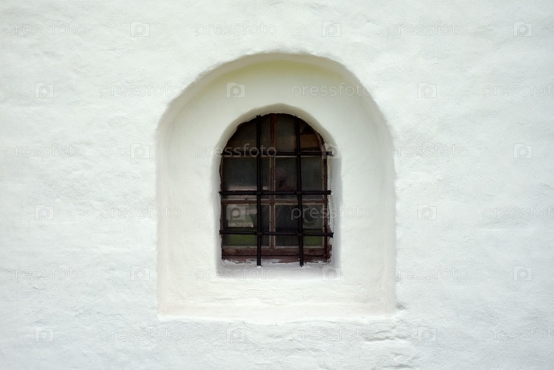 Фрагмент кирпичной стены с полукруглым окном. Стена окрашена белой краской. На окне установлена металлическая решетка