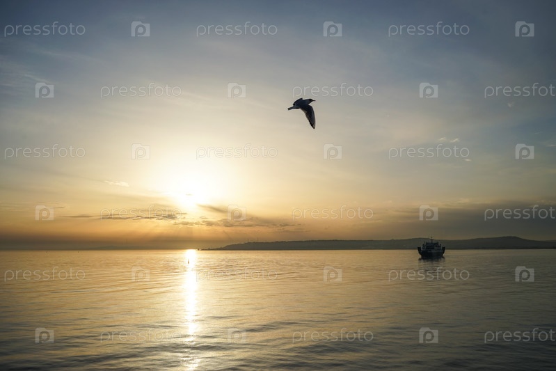 Морской пейзаж с чайкой над Керченским проливом. Россия