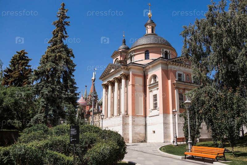Москва, Россия: Храм великомученицы Варвары на улице Варварка возле Красной площади в солнечный летний день. Вид на храм со стороны парка «Зарядье»