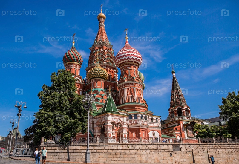 МОСКВА, РОССИЯ - 9 ИЮНЯ 2023 г.: Собор Василия Блаженного на Васильевском спуске на Красной площади в солнечный день на фоне ярко-голубого неба. Популярная туристическая достопримечательность Москвы